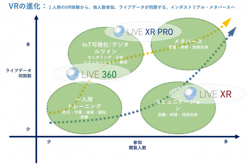 VRには高度・高品質なものから簡易なものまで、さまざまな種類が存在します。一般的にVRソリューションは、参加人数とデータの同期数によって、下表のように分類されます。
