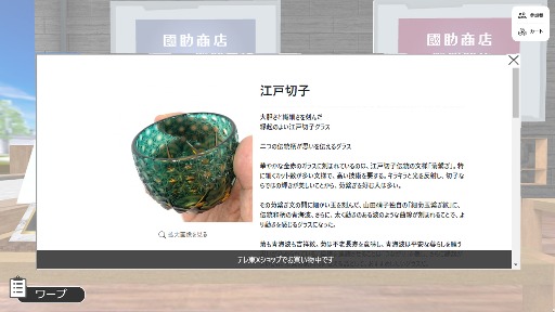 ネットショップ運営サービスシステムと連携し、バーチャル空間内店舗での商品購入におけるEコマースをシステムとして実現したサービス。商品購入という行動をバーチャル空間内でのEコマースを活用することにより、ECサイトでの購入とは違って、よりリアル店舗での商品購入行動に近づけることを実現しています。